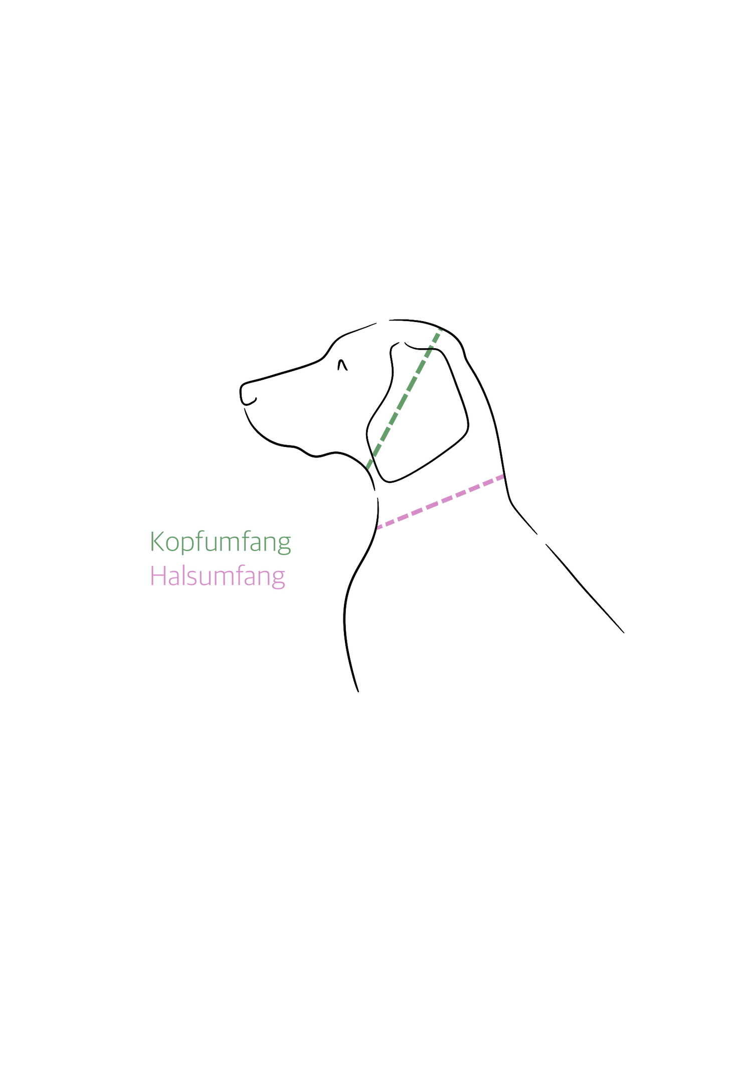 Für Zugstopp-Halsbänder benötigen wir den Kopfumfang, sowie den Halsumfang Eures Lieblings. Unsere Zeichnung soll Euch hierbei helfen.