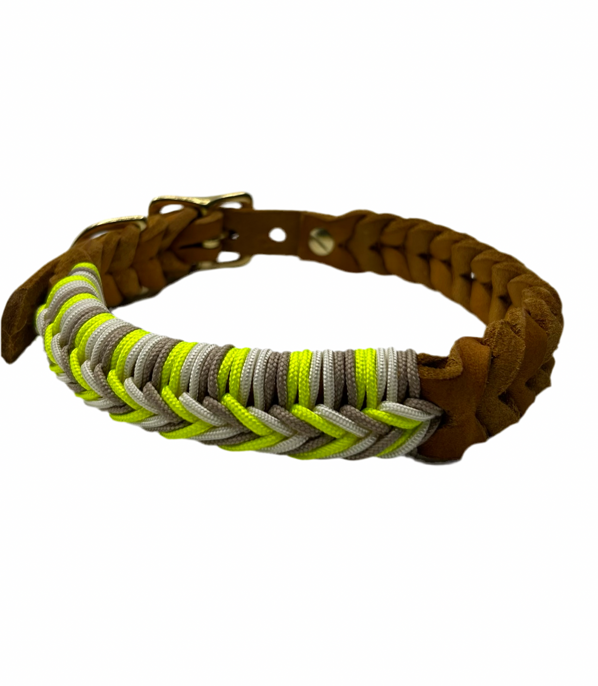 Wir haben unsere Kollektion Klassik kombiniert mit der Flechtung von Kollektion Carla… Feinstes Fettleder, das wir in liebevoller Handarbeit flechten, kombiniert mit Paracor'd Fäden… an einer stelle des Halsbandes… Die Paracordflechtung erstreckt sich über 1/4 des Halsbandes…